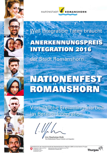 Im Oktober 2016 wurde dem Nationenfest der Integrationspreis der Stadt Romanshorn verliehen - "Für vorbildliche Freiwilligenarbeit im Bereich Integration".